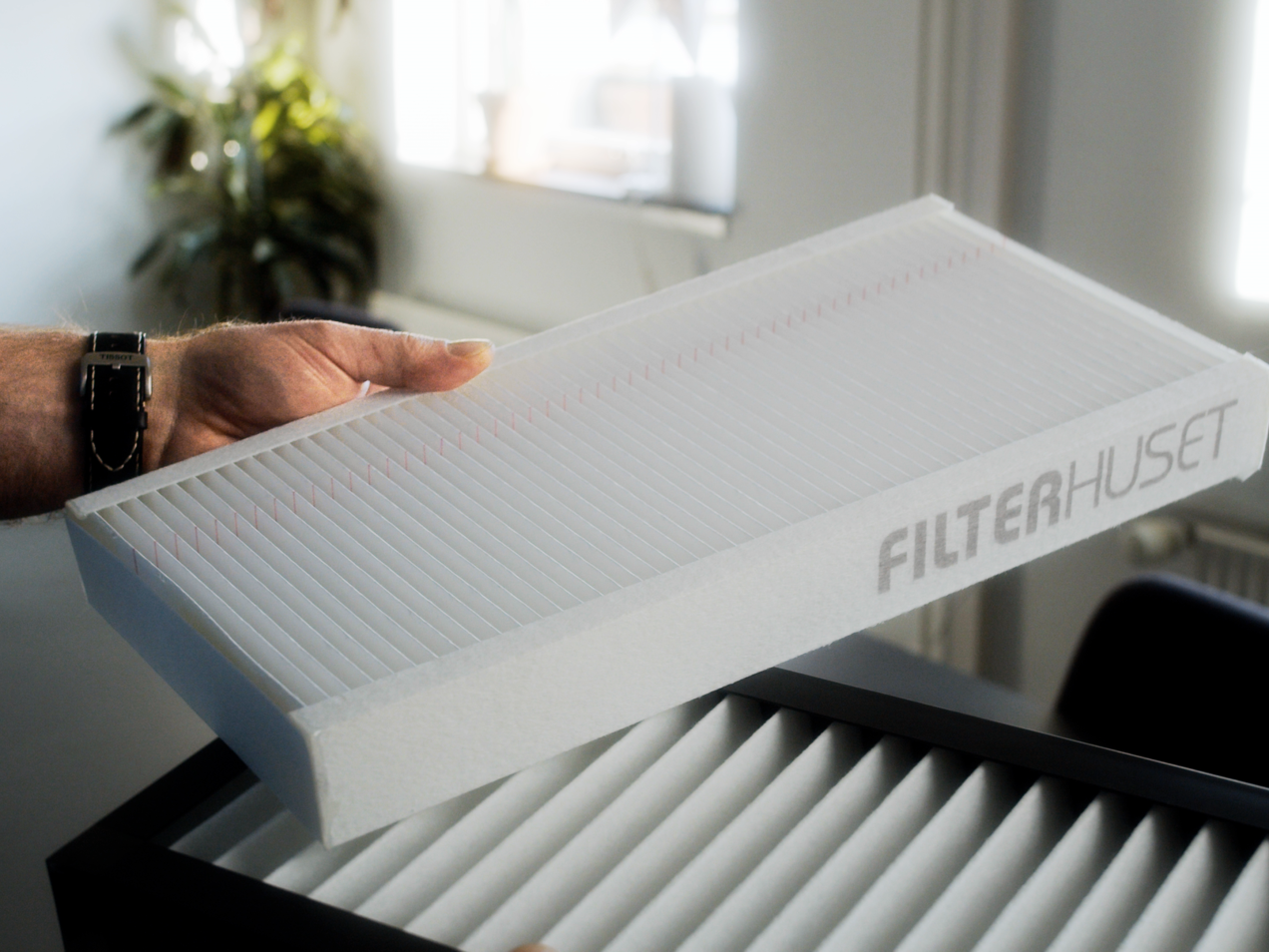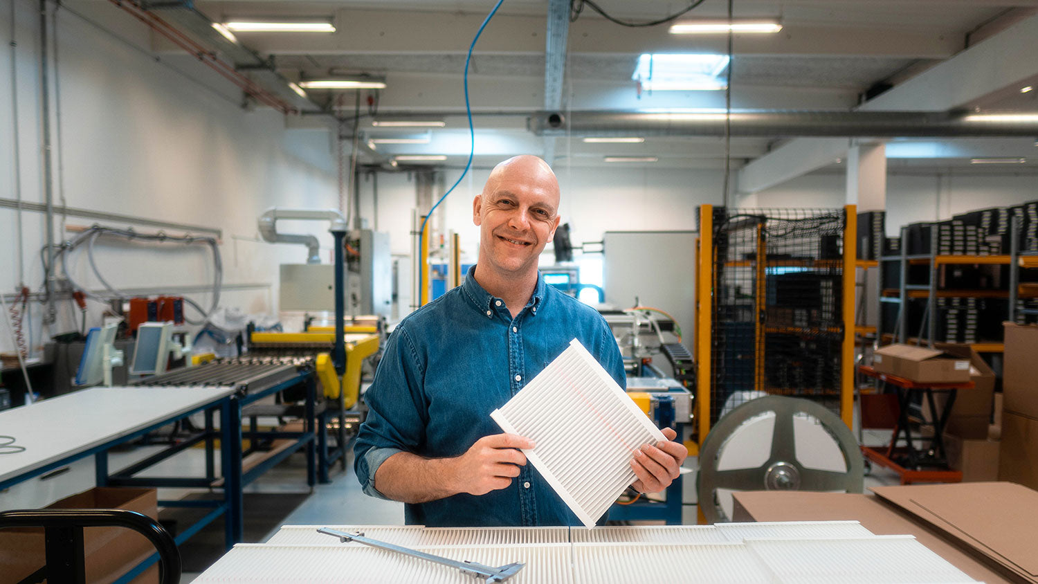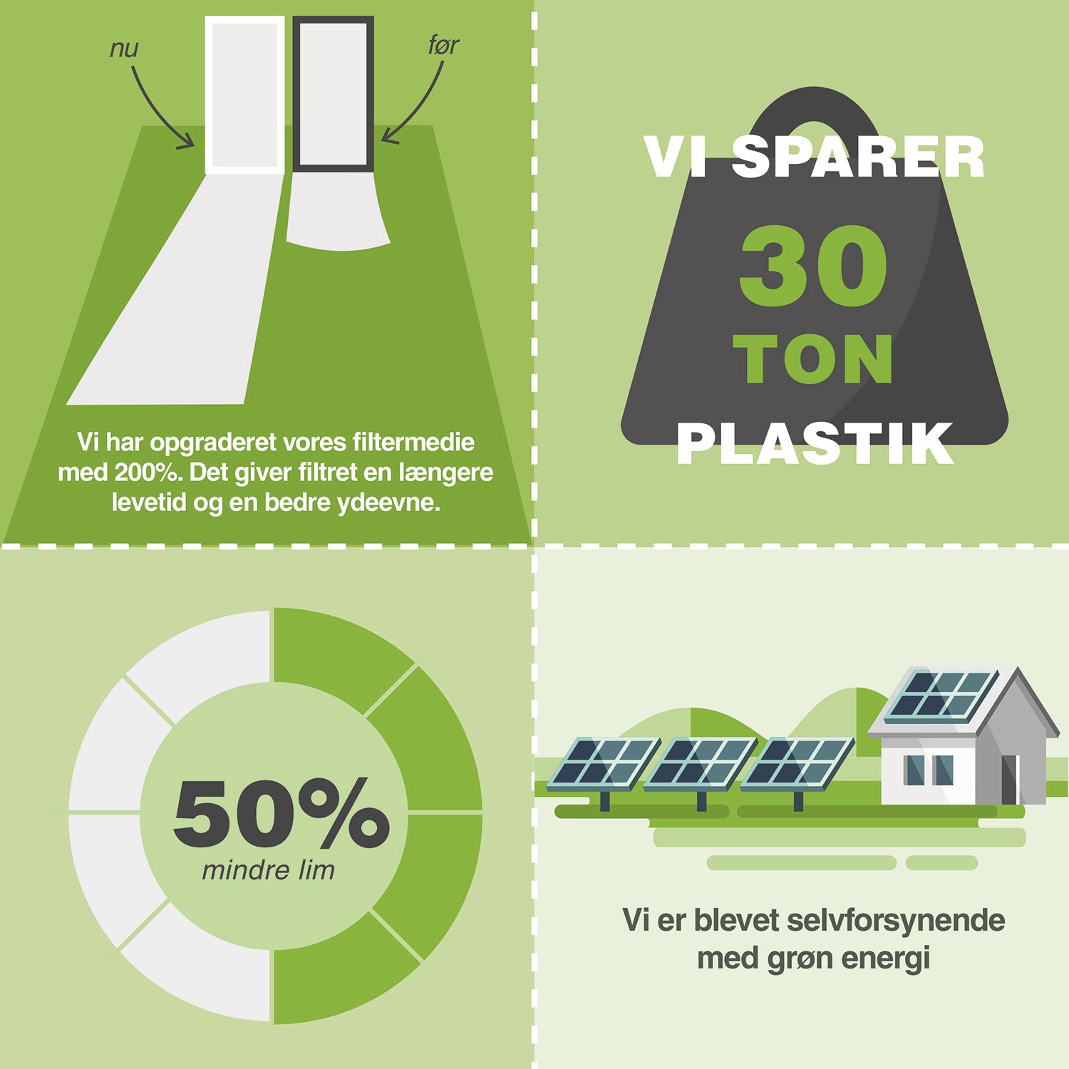 "Indkøbet af en ny maskine til vores produktion, har muliggjort det for os at producere vores filtre, uden den plastramme, som tidligere har været en nødvendighed for at holde sammen på filtermediet. I stedet lukkes filtrene nu af med ekstra filtermedie, så produktet beholder sin anvendelighed og funktionalitet som før men med op mod 200 procent mere filtermateriale tilføjet. Filterets levetiden forlænges dermed også.