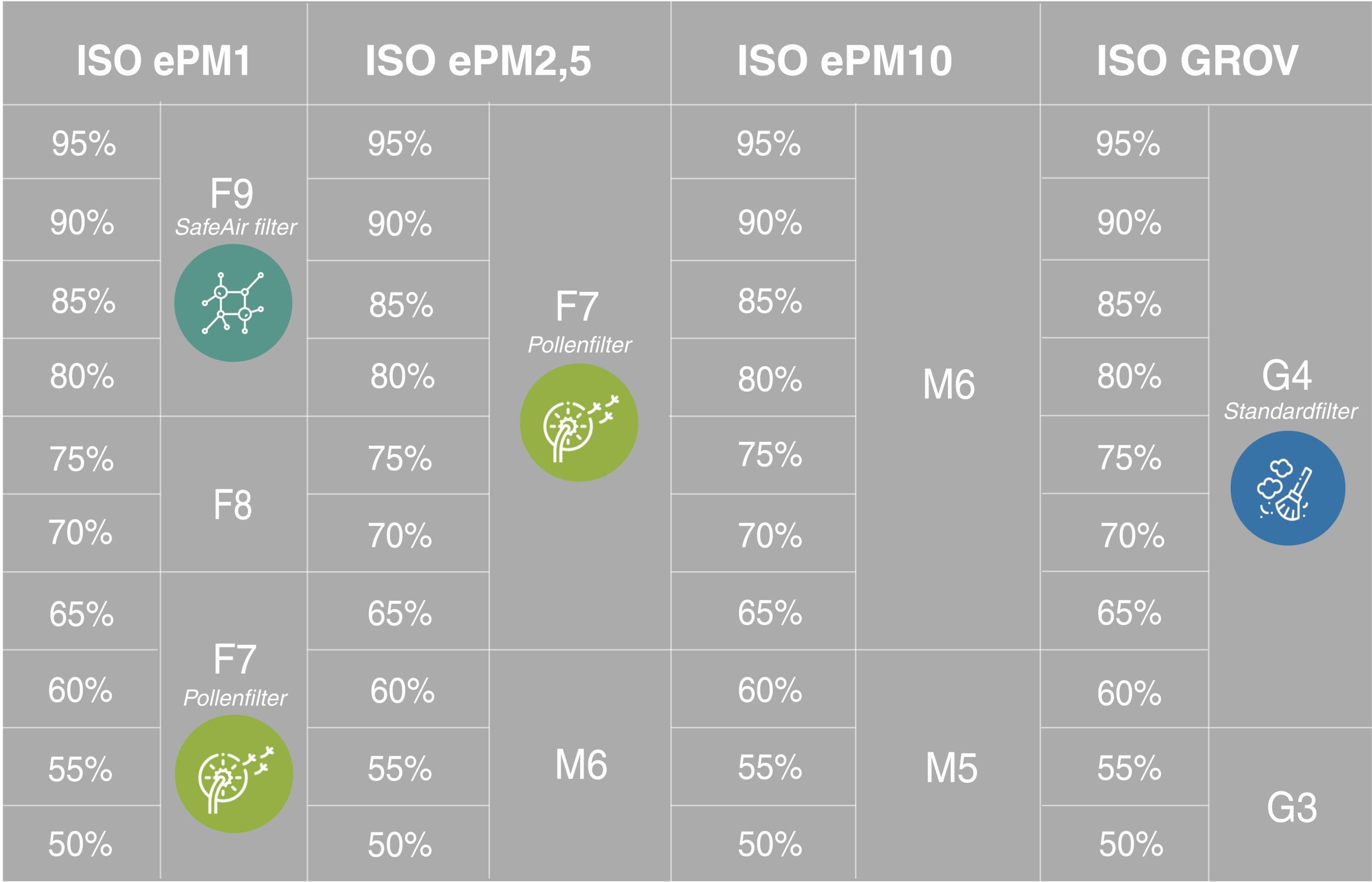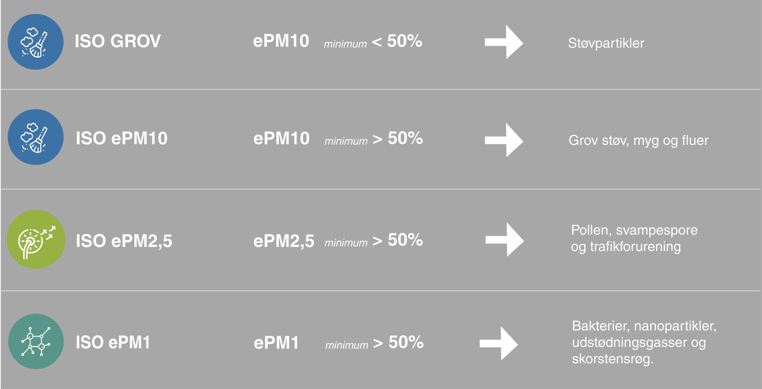 Vores ISO 16890 filtre overholder minimumskriteriet for hver gruppe, så vi sikrer, at luftfilteret fjerner mindst 50% af partiklerne. For at gøre det mere overskueligt har vi inddelt ISO 16890 klassificeringer i fire grupper.