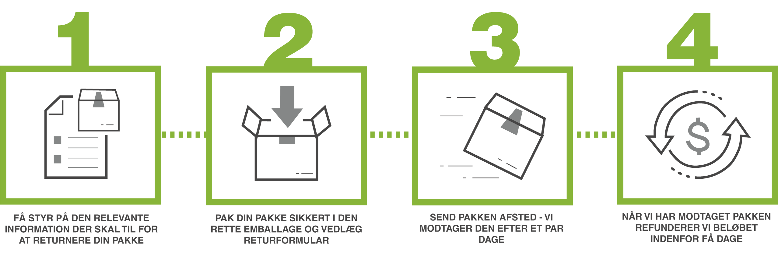 Varen skal altid sendes forsvarligt emballeret til normal pakkedistribution. Du står selv for betaling af returfragt.